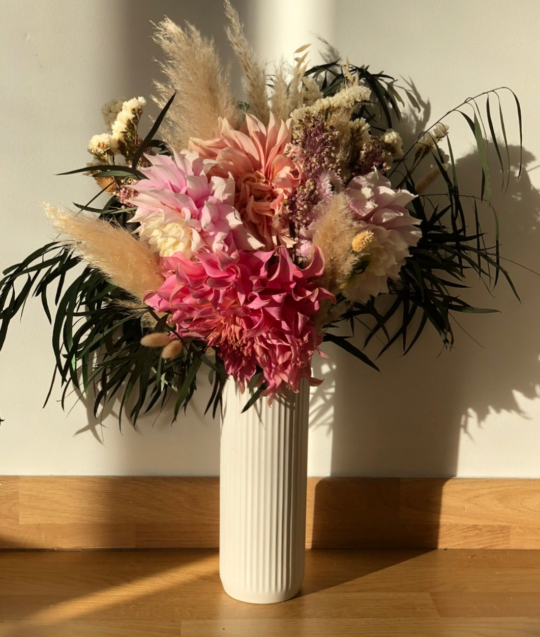 Nous composons des tableaux en fleurs séchées et végétaux stabilisés sur-mesure.